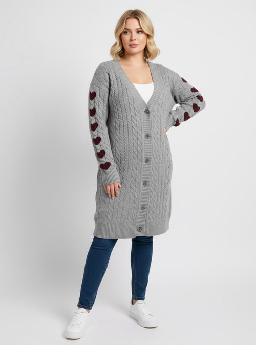 Cable-Knit Grey Cardigan with Heart Sleeves